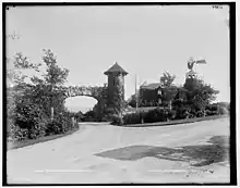 The large entrance gate to the estate is an elliptical, rough-cut granite arch with a small turret on the south side. On the north side of the gate, massive blocks of rough-cut, randomly coursed granite extend outward from a large natural granite outcrop to form the arch. On the opposite (south) side is a thirty-four foot tower. The uppermost level of the tower is corbeled. Above the corbeling of the tower are wooden brackets which support the rafters of the tower's conical roof. Originally, the roof was red terracotta tile, but at some unknown time these were replaced with wood shingles. Granite steps spiral around the exterior of the tower ending in a walkway across the arch to the granite ledge on the other side. Originally, the tower featured gargoyles with wrought iron lanterns hanging from their mouths. Within the wrought iron work of the large, hinged gates is the name of the estate, "Dunmere," in decorative script.