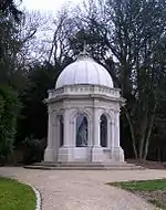 The Grecian Temple was built by the renowned Pulham family. Made from Portland stone and some Pulhamite,[17] the temple stands at the top of the avenue leading down to the fountain at the base of the hill. The temple has been part of the focus of the restoration project, partly to reveal the detailed and colourful painting inside that had been covered by sections of modern paint.[18] It is a Grade II listed building.[19]