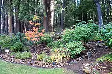 The Botanical Gardens encompass about ten acres (4 ha) of a hilly, wooded area with a meadow, a playground area, and picnic sites bordering the Upper Sacramento River. Native white dogwood is prolific in the park and blooms in the spring. There are many Shasta lilies growing on the hillsides and native azaleas grow along the river. In addition to the many native species, a variety of other perennial plants and shrubs have been introduced. These include rhododendrons, hostas, ferns and Japanese maples. During the spring and summer, various annual plants are cultivated.[2]