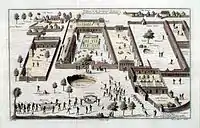 Prospect of the European factories at the Royal Palace of Savi. Included are the Portuguese, English, French and Dutch factories. The Dutch factory is at the bottom right.