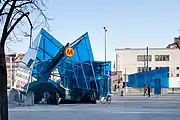The station fully opened for passenger use on 8 March 2015 as the eastern terminus of the inaugural stretch of Line M2 between Rondo Daszyńskiego and Dworzec Wileński.[1][2] It was designed by Polish architect Andrzej M. Chołdzyński and constructed by Metroprojekt.[3] Murals were created by Wojciech Fangor, artist of the Polish School of Posters.