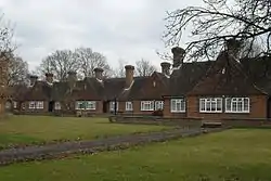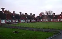 The road was mostly developed with "typical 1930s" terraced and semi-detached houses,[5][7] but a site on the north side was acquired by the Worshipful Company of Dyers in 1939 with money received from the sale of the Islington almshouses. They commissioned London-based architects Bertram and Company (the scheme architect was W.H. Hatchard-Smith)[8] to design, and Crawley firm Longley and Company to build, ten new houses and accommodation for a warden.[2][9] Construction was stopped temporarily when World War II broke out, but Longley and Company resumed a few weeks later when it became clear that "the expected bombing and gassing" was not imminent.[10] These first houses were finished in October 1940.[9] Another 16 houses were built in the same style in 1952 when money was left to the Company, and in 1971 (the quincentennial of the granting of the royal charter) another four houses were added.[9] Two are now used for other purposes (a common room and accommodation for a matron), leaving 28 in use by residents. A mixture of couples and single people occupy the houses; the criteria set by the Company are that applicants should be "of good character and modest means". Applicants must write to the Company clerk and go through an interview, after which they are placed on a list for a house.[2][9] Most residents are retired people who have previously lived in Crawley or who have family connections to the town.[2]