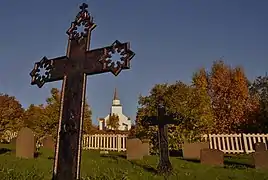 In 1880, a new long church was built about 60 metres (200 ft) to the northwest of the older church. The new building had a tower on the west end. After the new church was in use, the old church was torn down. The cemetery by the old church is still in use, a short distance from the new church building.[5]