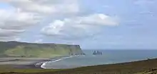 The view from Dyrhólaey is broad: To the north is to be seen the big glacier Mýrdalsjökull. To the east, the black lava columns of the Reynisdrangar come out of the sea, and to the west the whole coastline in the direction of Selfoss is visible – depending on weather conditions. In front of the peninsula, there is a gigantic black arch of lava standing in the sea, which gave the peninsula its name (meaning: door hill island).[5]