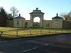 In its history it has hosted numerous championships, including the 1974 JNF pro-am golf tournament, featuring 136 golfers.[3] Due to its close proximity to Elstree Studios it has been extensively used as a filming location for numerous TV series and films, including The Saint, The Avengers and "The Smile Behind the Veil" episode of Randall and Hopkirk (Deceased) in the 1960s and films such as The Strange World of Planet X (1957), The Devil's Disciple (1959) and The Secret of My Success (1965).[4][5] A lake is located in the grounds. Until 1965, the house and park lay in Middlesex. The entrance gates are listed Grade II*.[6]