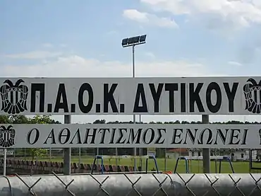 PAOK Dytikou (Greek: ΠΑΟΚ Δυτικού) is a Greek football club based in Dytiko, Pella, Greece.[11] The official motto of the club is Ο Αθλητισμός ενώνει, meaning Sport unites when translated into English.[12][13]