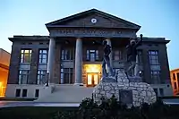 The original Doughboy statue was completed in early 1921 and erected in the middle of Marion Avenue just behind its current location in late July or August 1921, but was left veiled until late 1923 when payment for the sculpture and impressive base was finally received.[15] Hundreds of mass-produced replicas were installed in front of American city halls and courthouses and in public parks and cemeteries. The exact number may never be determined, but there are approximately 140 extant today, in 38 different states. A total of 153 are listed in the SIRIS database, though some have been destroyed by weather, accidents, or vandalism, and some, unfortunately, are listed in error, and usually turn out to be John Paulding's very similar statue "Over the Top".[16][17]