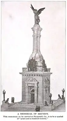 In 1913, as the 50th anniversary of the end of the Civil War approached, The Blue and the Gray Association of America proposed that a Peace Memorial be built in Fitzgerald, Georgia, the town where Confederate President Jefferson Davis had hidden from Union troops.[10] Viquesney's design featured a square stone pavilion with bronze sculpture groups above the cornice, and a stone tower crowned by a bronze goddess of Peace.[11]