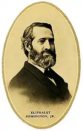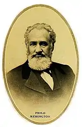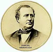 In 1839 Eliphalet was joined by his oldest son, Philo Remington (to make the business "E. Remington & Son"), and in 1845 his second son, Samuel, also joined the company, afterwards called "E. Remington & Sons".[4] Remington's third son, Eliphalet III, would later join the company as well. During this period, the Remingtons specialized almost exclusively in the manufacture of rifle barrels. These barrels, marked with the distinctive "REMINGTON" stamp near their breeches, were recognized for their quality and reasonable price. Many, if not most, of the independent gunsmiths in the Mohawk Valley purchased completed (but not rifled) barrels from Remington and assembled them into firearms custom ordered by their customers. As demand increased, the Remingtons added other parts to their inventory, first percussion locks made in Birmingham, England but marked with their stamp "REMINGTON", and later sets of brass gun furniture, including trigger guards, butt plates, and patch boxes. After 1846, first martial longarm and then revolver production dominated the company's workforce.[5][6]