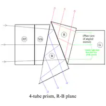 In an early configuration of the prism block, shown in the thumbnail, three of the pick-up tubes were envisaged to be in a common plane, but with the fourth (red) tube sticking up, nearly at right angles to the other three. (This configuration was to be used in the Russian four-tube camera type KT-116M.[4])