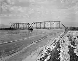 The ETR Big Island Bridge is a Pratt through truss bridge located near Green River, Wyoming, which carries Sweetwater County Road CN4-4 across the Green River. The bridge was built from 1909 to 1910 by contractor Charles G. Sheely. It was named the Big Island Bridge after the Big Island region of Wyoming, which the bridge connected to other parts of the state. The 352-foot (107 m), two-span bridge is one of the older Pratt through truss bridges in Wyoming, and its spans, each 155 feet (47 m) long, are some of the longest on bridges of this design in the state.[2]