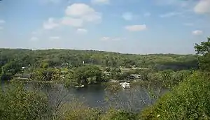 Ganymede Spring, or Ganymede's Spring,[14] is located along a path near the east bank of the Rock River at the base of Eagle's Nest Bluff, about 0.25 miles (400 m) north of the Black Hawk Statue.[9][10] The natural spring, which originates in the limestone beneath Fond du Lac, Wisconsin, supplied the colony with water for cooking, drinking and for use in their swimming pools.[9] One pool was at the base of the spring and the other was located where the present-day NIU parking lot is found.[9] The original pool at the base of the spring can still be seen when the water level on the Rock River is low.[10] Originally, from 1898–1902 water was transported up the hill by horse and wagon. By 1902 a large pump was installed, though it took two attempts, and a water tower dispensed water to the various buildings.[9]