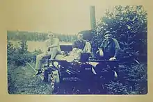 During the winter of 1926-27, Édouard Lacroix's Madawaska Company used log haulers to move heavy railway equipment overland from Lac-Frontière, Quebec to Churchill Depot and then over frozen Churchill Lake and Eagle Lake. The log haulers delivered two steam locomotives, two Plymouth gasoline-powered switchers, miles of steel rail, and sixty railroad cars for carrying pulpwood. Each railroad car was 32 feet (9.7 m) long with high, slatted sides to hold 12 cords of pulpwood. Three diesel-powered conveyors were built to lift pulpwood logs from Eagle Lake to a height of 25 feet (7.6 m) over a distance of 225 feet (68 m). Each conveyor could fill a railroad car in 18 minutes.[3] Lacroix completed the Umbazooksus and Eagle Lake Railroad to a pulpwood-unloading trestle at the north end of Umbazooksus Lake.[4] Lacroix's railroad included a 1500-foot (460 m) long trestle across the north end of Chamberlain Lake.