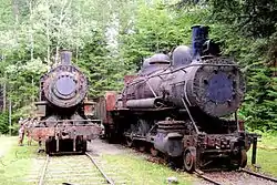 The engine house became a popular snowmobile destination in the 1960s;[7] and fittings like gauges, bells, headlights, and number plates began to disappear from the locomotives before the wooden cab of engine #1 was destroyed when the engine house burned in 1969.[8] The locomotive boiler jackets and asbestos lagging were removed in 1995 but the stripped locomotive shells remain a unique reminder of the industrial revolution in the Maine North Woods.[5]