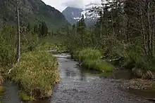![]() The Northern face of Eagle Peak remains covered in snow throughout early summer | |