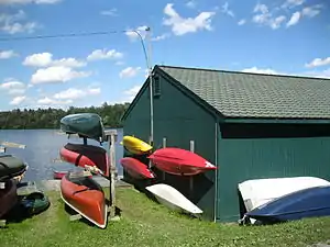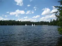 The kidney-shaped Eagles Mere Lake covers 230 acres and is about 3/4 mile long. It is a natural spring-fed lake with exceptionally clear water in the Allegheny Mountains at an elevation of 2100 feet. Early resort promoters prohibited construction and tree cutting within 100 feet of the lake to protect the shoreline. The shoreline continues to be forested and is now owned by the Eagles Mere Association. Pristine forested areas with hiking trails surround the lake, and they are in turn surrounded by several thousand acres of more forest.[4]
