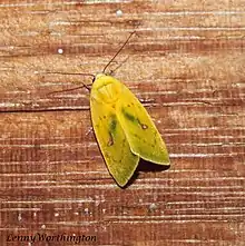 The wingspan is about 15 mm. Head, thorax and forewings are bright yellow. There are very indistinct antemedial and postmedial greenish lines. The outer margin is tinged with green. A brown annulus on the discocellulars is present.[1] Hindwings are semi-diaphanous white with apex suffused with yellow.[2]