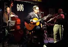 ![]() Simon Woolf (bass), Okin (guitar) Michèle Drees (drums) hidden, and Steve Rubie (flute) at the 606 Club on 10 January 2016 | |