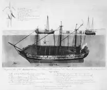 The battle of Pulo Aura was a minor naval engagement fought on 14 February 1804, in which a fleet of East Indiamen, including Earl of Abergavenny, intimidated, drove off, and chased a powerful French naval squadron, although the French squadron was much stronger than they. Commodore Nathaniel Dance's aggressive tactics persuaded Contre-Admiral Charles-Alexandre Durand Linois to retire after only a brief exchange of shot. Dance, in Warley, together with several of the other vessels, then chased the French warships until his convoy was out of danger. The British lost only one man killed.[6] Earl of Abergavenny did not actually take part in the exchange of fire.