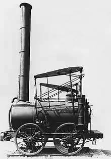 The line opened on 2 June 1829 with the steam locomotive Agenoria purpose-built to haul wagons of coal from pits to the canal basin. The railway crossed land either owned by the Dudley Estate or leased by James Foster. The line was known as the Kingswinford Railway although sometimes it was called the Shutt (or Shut) End Railway. It was a standard gauge line set on stone blocks. From the Ashwood canal basin, the line ran up an incline for around 500 yards before reaching a level section which extended for around 2 miles. The line then tilted upwards again for a second incline to the vicinity of Shut End. A short level section brought it to its termination at Corbyn's Hall collieries. Agenoria only had sufficient power to pull carriages along the level section of the line. The two inclines were worked by self-acting mechanisms where loaded coal wagons moving down the slope pulled empty wagons uphill.[4] The locomotive, constructed by Foster Rastrick & Co of Stourbridge ran for in excess of three decades. After a period of neglect, it was eventually donated to the Science Museum in South Kensington in 1885 and is now on display at the National Railway Museum in York.[5]