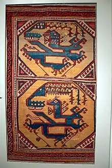A traditional Chinese motif, the fight between the fenghuang, or Chinese phoenix, and the dragon, is seen in an Anatolian carpet at the Pergamon Museum, Berlin. Radiocarbon dating confirmed that the "Dragon and Phoenix" carpet was woven in the mid 15th century, during the early Ottoman Empire.[2] It is knotted with symmetric knots.[3] The Chinese motif was probably introduced into Islamic art by the Mongols, or artists working for them, during the thirteenth century.[4]
