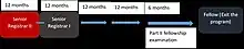 Upon gaining admission into the residency program in an accredited institution, the first examination is usually written after a specified period of training ranging from 24 months to 36 months, with success translating to a registrar's promotion to a Senior Registrar. The second examination holds after another period of a minimum of 24 months to 36 months, where the resident is expected to produce a thesis and be involved in the training of junior residents and medical students. He then becomes a fellow at the training's expiration and is expected to exit the training program six months after passing the final examination. He may be appointed a Consultant at the same institution if vacancies exist or at another facility.