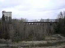 The East 34th Street Bridge is a concrete open-spandrel bridge in Tacoma, Washington. The bridge was built in 1937 to replace a wood bridge that had previously spanned the gulch. The bridge is constructed of two rib arches, that are supported by 24-foot (7 m) support legs, with spandrel columns between the arches and the bridge's 485-foot (148 m) deck. The concrete railings on the deck are adorned with urn-shaped lampposts.[2]