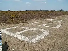 An airfield was built in East Boldre in 1910.[9] There was a flying school here for two years before the airfield reverted to quiet grazing land. In 1914 one of the sheds on the airfield was taken over by the Royal Flying Corps and by 1915 the demand for pilots for World War I was so great that a training school called RFC Beaulieu was built on the area.[9] On 24 October 1917, the village post office at East Boldre was accidentally damaged by a British aeroplane, and for six months the elderly inhabitants had to live under tarpaulins in the house even whilst transacting postal business.[10] The camp was closed in 1919.[9] The airfield identification letters, BEAULIEU, have been restored and are still visible at his location 50°48'25.9"N 1°28'52.7"W