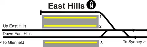 A new station was built south-east of the original station as part of the extension opening in August 1987 with the original station closed and demolished.[4] Following the extension, East Hills became the main intermediate terminus and an interchange point between all stops and limited stops trains. In addition to the two through tracks (platforms 2 and 3), a side terminating track (platform 1) was provided. A new centre turnback at Revesby opened in 2009 as part of the Rail Clearways Program, which ended East Hills' role as the primary intermediate terminus.