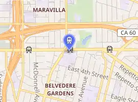 East LA Civic Center is an at-grade light rail station on the L Line of the Los Angeles Metro Rail system. It is located at the intersection of 3rd Street and Mednik Avenue in East Los Angeles, California. The station is served by the L Line.[1] This station opened on November 15, 2009, as part of the Gold Line Eastside Extension.