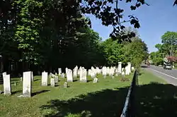 The cemetery is a plot of 2 acres (0.81 ha). Graves are arranged in rows emanating from a central aisle. In its early days the boundaries of the cemetery were marked by stone walls, but these were replaced in the 19th century by wood fencing, and chain link fencing in 1985. The stone gate marking the entrance is the most prominent feature of the cemetery. Most of the gravestones are modest in size and decoration; there are only five significant markers. The two largest of these flank the entrance gate, and are miod 19th century monuments for Chamberlin family members. A similarly styled monument to those two commemorates the Maynard family, while a squat obelisk in the tenth row marks graves of the Cleveland family. The most ornate marker is for James Bardin (died 1855): it has a high pedestal supporting a round column, topped by an urn and encircled by a wreath.