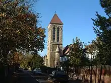 East Sheen lies in the ecclesiastical parish of Mortlake with East Sheen. In addition to the Parish Church of St Mary the Virgin the district has two daughter churches: Christ Church, and All Saints. Christ Church, situated near the crossroads of Christchurch Road and West Temple Sheen, was built by Arthur Blomfield on land formerly part of a farm at the entrance to Sheen Common in the 1860s. It was originally planned to be opened in April 1863; however, the tower collapsed shortly before completion and had to be rebuilt. The church was finally completed and consecrated nine months later, on 13 January 1864.[15]