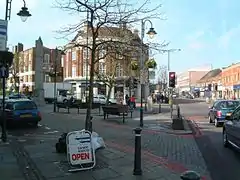 East Sheen concentrates its commercial area to the main through street: its long high street has transport/furniture/hardware shops, convenience services, offices, restaurants, cafés and pubs[13] and suburban supermarkets and is also the economic hub for Mortlake of which East Sheen was once a manor. This wide-footpath street is the Upper Richmond Road West which connects Richmond to Putney. Central to this street is The Triangle, a tree-lined traffic island with a war memorial and an old milestone[3] at the intersection of Upper Richmond Road West with Sheen Lane. The main railway station serving the area, Mortlake, is centred 300m north of this.[14]