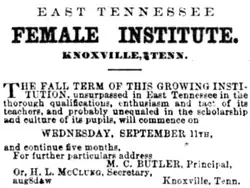 The East Tennessee Female Institute was an all-female institution of higher learning that operated in Knoxville, Tennessee, United States, from 1827 until 1911. Originally chartered as the Knoxville Female Academy, the school offered high school and college-level courses to the women of Knoxville and surrounding counties in the years before the University of Tennessee became coeducational. With the rise of free public education in Knoxville in the early 1900s, the institute, which was tuition-based, gradually declined.[1]