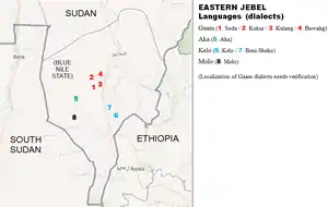 The other three were spoken in isolated pockets to its south, but are now probably extinct: Aka in the Sillok Hills, Kelo in the Tornasi Hills on jebels Tornasi (Kayli village) and Beni Sheko, and Molo at Jebel Malkan near the Ethiopian border.