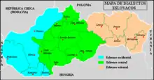 ![]() Map showing the distribution of the Western, Central and Eastern dialects of Slovak | |