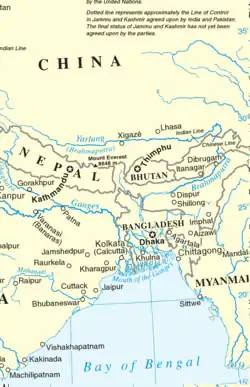 There are numerous transboundary rivers in the region, which has been a cause of water sharing disputes. Bangladesh and India share 54 transboundary rivers, but they do not have a comprehensive river management treaty.[58] There has also been criticism of India's existing water sharing and hydropower agreements with Nepal and Bhutan.[59][60] Bangladesh and India are also concerned by Chinese efforts to dam the Brahmaputra River.[61]