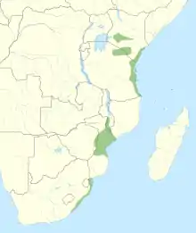 The eastern green mamba is native to regions near the coastlines of Southern Africa and East Africa. Its range extends from Kenya south through Tanzania, Malawi, and eastern Zimbabwe; it can also be found in Zanzibar and northern Mozambique.[15][16] An isolated and genetically distinct population is found in South Africa from the extreme northeastern part of Eastern Cape along the KwaZulu-Natal coastline and into southern Mozambique.[8]