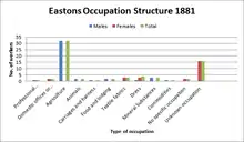 In 1881, male and female occupations drastically differentiated as 16 males worked in Agriculture and 16 females worked in Unknown Occupations. Therefore, Agriculture was the most popular occupation for males and Textile Fabrics / Dress was the most popular known occupation for females as it provided them with 6 jobs.[19]