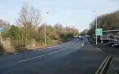 ![]() View looking north towards Eastwood on Thornliebank Road, with green 'Welcome to Glasgow' sign denoting city boundary | |
