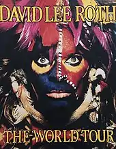With the success of the Eat 'Em and Smile album in North America, Roth embarked upon an extensive tour. The setlist was almost evenly split between Van Halen classics ("Unchained", "Panama", "Jump", etc.) and Roth solo hits ("California Girls", "Yankee Rose", "Goin' Crazy", etc.). As with past Van Halen tours, Roth once again incorporated a concert trademark in which he sang a song ("Ain't Talkin' 'Bout Love") from a mini stage in the middle of the venue at each performance, while the rest of the band continued to perform on the main stage.[1] Another concert highlight was an extended guitar and bass solo "battle" (often lasting over ten minutes), which saw Vai and Sheehan try to top each other on their respective instrument.[2] No professionally filmed or recorded video or audio footage has ever been released from this tour, but its massive stage set can be seen in the performance section of the "Yankee Rose" video.[3] The opening acts on this tour included Cinderella and Tesla at various points.