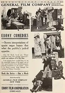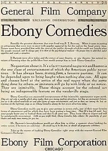 Ebony Film Corporation was a film company established in Chicago in 1915 as Historical Feature Film Company.[1] Its films were distributed "exclusively" by General Film Company. The company's films and its depictions of African Americans caused outrage and opposition from African Americans.[1] The company used a logo of a monkey in blackface.[2] The business folded in 1919.[3]