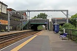 The station is staffed part-time, with a small ticket office (rebuilt in the summer of 2013) at street level. The ticket office is open in the morning and early afternoon six days per week (06:25 to 12:55 weekdays, 07:25 to 13:55 Saturdays, closed Sundays). A ticket machine is available outside these times and for collecting pre-paid tickets. There are basic shelters, digital information screens and timetable poster boards on each platform, along with a P.A system to provide automated train running announcements (the information screens, CCTV cameras & P.A. speakers were installed in September 2015).[3] Step-free access is not possible to either platform, as they can only reached by staircases from the road above.[4]