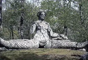 Hesiod's Echidna was half beautiful maiden and half fearsome snake. Hesiod described "the goddess fierce Echidna" as a flesh eating "monster, irresistible", who was like neither "mortal men" nor "the undying gods", but was "half a nymph with glancing eyes and fair cheeks, and half again a huge snake, great and awful, with speckled skin", who "dies not nor grows old all her days."[10] Hesiod's apparent association of the eating of raw flesh with Echidna's snake half suggests that he may have supposed that Echidna's snake half ended in a snake-head.[11] Aristophanes (late 5th century BC), who makes her a denizen of the underworld, gives Echidna a hundred heads (presumably snake heads), matching the hundred snake heads Hesiod says her mate Typhon had.[12]