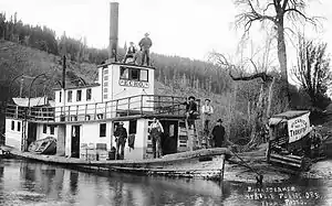 In 1901 only three steamers served on the river between Coquille and Myrtle Point, these were the propeller Reta (18 registered tons) the sternwheeler Echo (53 registered tons) and Welcome (21 registered tons).[4] Between these three vessels they hauled 1,554 tons of freight upriver and 2,834 tons downriver.[4] Upriver, the biggest single item was general merchandise, 800 tons.[4] Downriver was almost entirely agricultural products, with the biggest single item being 1,035 tons of milk.[4] 10,187 passengers were carried up and downriver.[4]