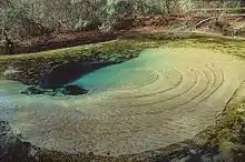 Much of the river's flow comes from 11 named springs or spring groups consisting of more than 36 vents, including the first magnitude Gainer Springs Group and four second magnitude springs. The springs on Econfina Creek are concentrated in a 4.75 miles (7.64 km) long section where the river cuts through the Floridan Aquifer.[2][3][4] More than 80% of the normal discharge of Econfina Creek into Deer Point Lake comes from the springs in this part of the river.[7]