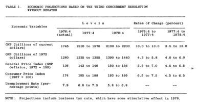 When the CBO did a revised forecast to account for the removal of the rebate, the CBO estimated an increase of unemployment rate of 0.2 percent. The increase in unemployment would result in a loss of 280,000 jobs in 1977, while the forecast for unemployment for 1978 remains unchanged.[21]