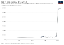 The economic history of Italy after 1861 can be divided in three main phases:[6] an initial period of struggle after the unification of the country, characterised by high emigration and stagnant growth; a central period of robust catch-up from the 1890s to the 1980s, interrupted by the Great Depression of the 1930s and the two world wars; and a final period of sluggish growth that has been exacerbated by a double-deep recession following the 2008 global financial crush, and from which the country is slowly reemerging only in recent years.