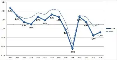 Italy's economy in the 21st century has been mixed, experiencing both relative economic growth and stagnation, recession and stability. In the late 2000s recession, Italy was one of a few countries whose economy did not contract dramatically, and kept a relatively stable economic growth, although figures for economic growth in 2009 and 2010 averaged in the negatives, ranging from around -1% to -5%.[40] The late-first decade of the 21st century recession has also gripped Italy; car sales in Italy have fallen by almost 20 percent over each of the past two months. Italy's car workers' union said; "The situation is evidently more serious than had been understood."[41] On 10 July 2008 economic think tank ISAE lowered its growth forecast for Italy to 0.4 percent from 0.5 percent and cut the 2009 outlook to 0.7 percent from 1.2 percent.[42] Analysts have predicted Italy had entered a recession in the second quarter or would enter one by the end of the year with business confidence at its lowest levels since the September 11 attacks.[43] Italy's economy contracted by 0.3 percent in the second quarter of 2008.[44]