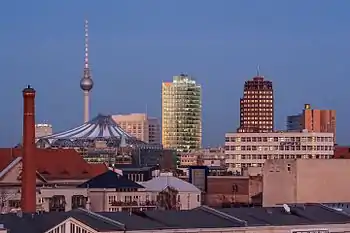 Fast-growing sectors are communications, life sciences, mobility and services with information and communication technologies, media and music, advertising and design, biotechnology and environmental services, transportation and medical engineering.[4] Since 2015 Berlin is the top congress city in the world and is home to one of Europe's biggest convention centers in the form of the CityCube Berlin (formerly Internationales Congress Centrum). It contributes to the increasing tourism sector encompassing 592 hotels with 90,700 beds (2007 figures) and numbered over 22 million overnight stays by 9.8 million tourists in 2011.[5] Berlin has established itself as the third most visited city destination in the European Union.[6][7]